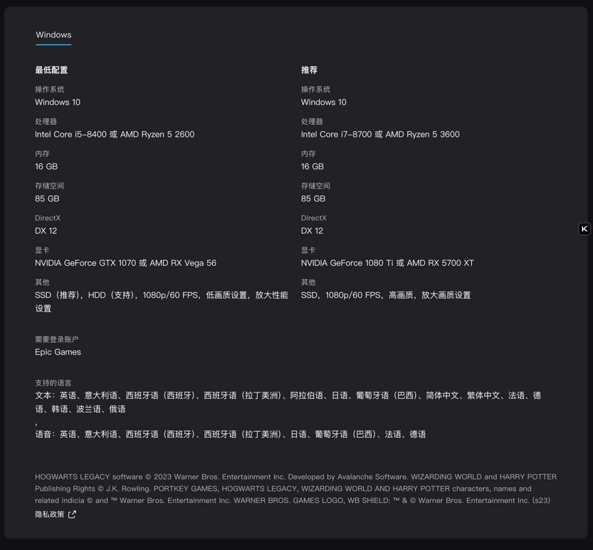 本作于 2023 年 2 月 10 日登陆 Steam 平台,目前玩家好评率为 90%“特别好评”,游戏支持简体中文,玩家可以在游戏中造访《哈利・波特》系列书籍中的熟悉地点,同时结识盟友、与敌人战斗并决定故事走向。
