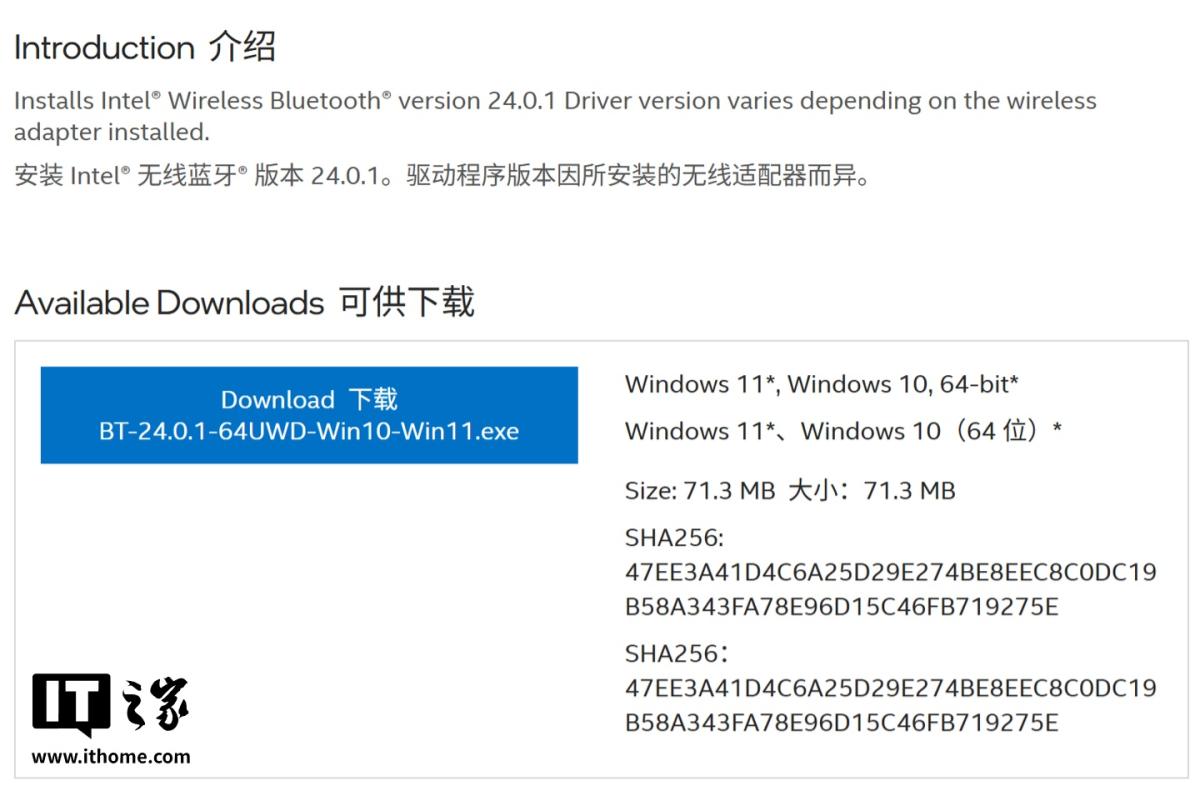 英特尔也发布了版本号为 24.0.1 的蓝牙驱动。根据官方说明,新版蓝牙驱动包含了一系列“功能更新”。虽然官方未列出详尽的变更日志,但明确表示这些更新旨在提升设备连接的稳定性和整体性能,解决了旧版本中可能存在的部分断连或延迟问题。