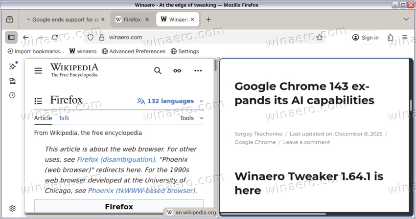 12 月 10 日消息,科技媒体 Winaero 昨日(12 月 9 日)发布博文,报道称 Mozilla 发布 Firefox 浏览器 146 稳定版,核心亮点是引入“分屏视图”(Split View)模式,支持用户在单窗口内并排浏览标签页,但目前需手动开启。