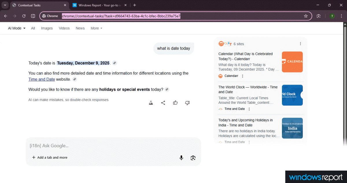 在此援引 Windows Report,目前该功能已在 Chrome Canary 金丝雀版中上线,当全新 AI 模式启动时,系统会打开内建的 chrome://contextual-tasks 以运行 AI 模式,这意味着该 AI 模式是直接内嵌在浏览器内部的,不依赖普通网页。
