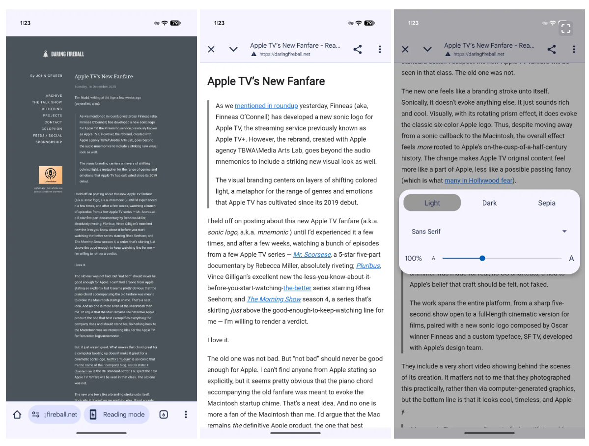 为满足不同视力与阅读习惯的需求,新版阅读模式保留并优化了丰富的自定义选项。用户不仅可以切换浅色、深色及复古(Sepia)三种背景色调,还能选择无衬线(Sans Serif)、衬线(Serif)或等宽(Mono)等字体风格。
