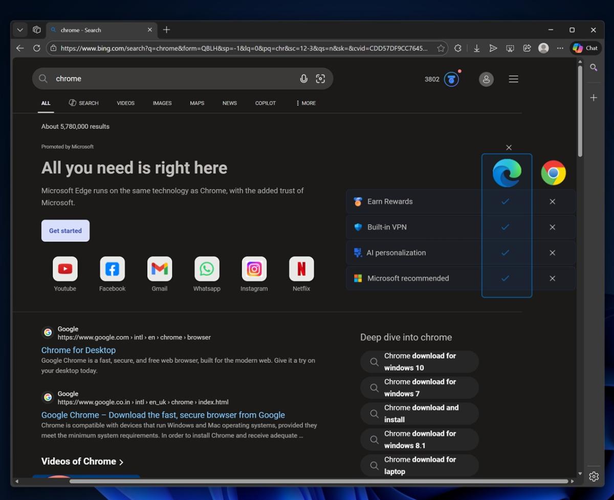 目前用户在 Windows 11 上尝试下载 Google Chrome 时,就会遭遇类似的“拦截”。具体表现为:当用户在 Bing 搜索“Chrome”后,系统会弹出提示,强调 Edge 拥有 Microsoft Rewards 积分系统以及 Copilot AI 助手。