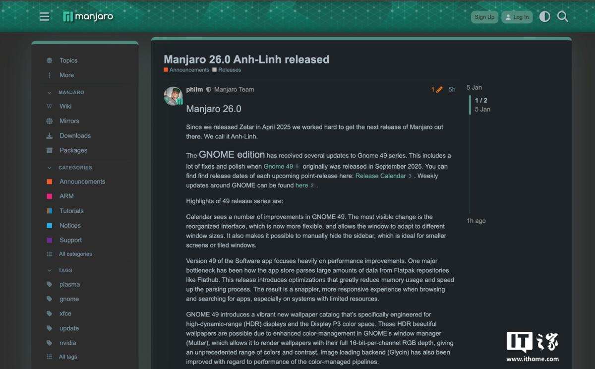 1 月 5 日消息,继上月推出 Manjaro Linux 25.1 预览版之后,Manjaro 团队今日正式推送了 Manjaro Linux 26(代号 Anh-Linh),默认采用 Linux 6.18 内核,附项目地址(点此访问)。