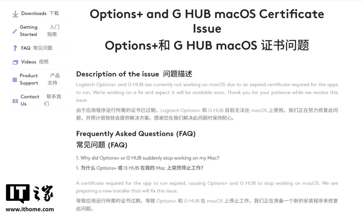 而罗技官方今天在官网承认了这个问题并解释道,此次大规模故障的发生原因是应用运行所需的证书过期,并且只影响 macOS 平台,他们正在努力修复问题并准备新安装包来修复。