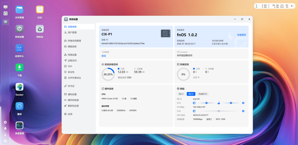 了解到,围绕 Armv9.2 架构与 12 核多核设计,fnOS 对系统调度、资源分配与负载表现进行了深度优化,确保在高并发、多任务场景下稳定运行。