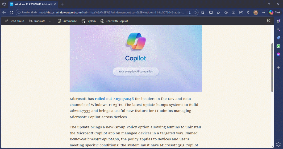 例如点击“摘要”,Copilot 会在右侧面板生成文章概览;点击“解释”,回应同样出现在侧边栏。这种设计实际上是将用户的注意力从文章内容引向了侧边辅助区域,让原本的“全屏沉浸”变成了“分屏交互”。
