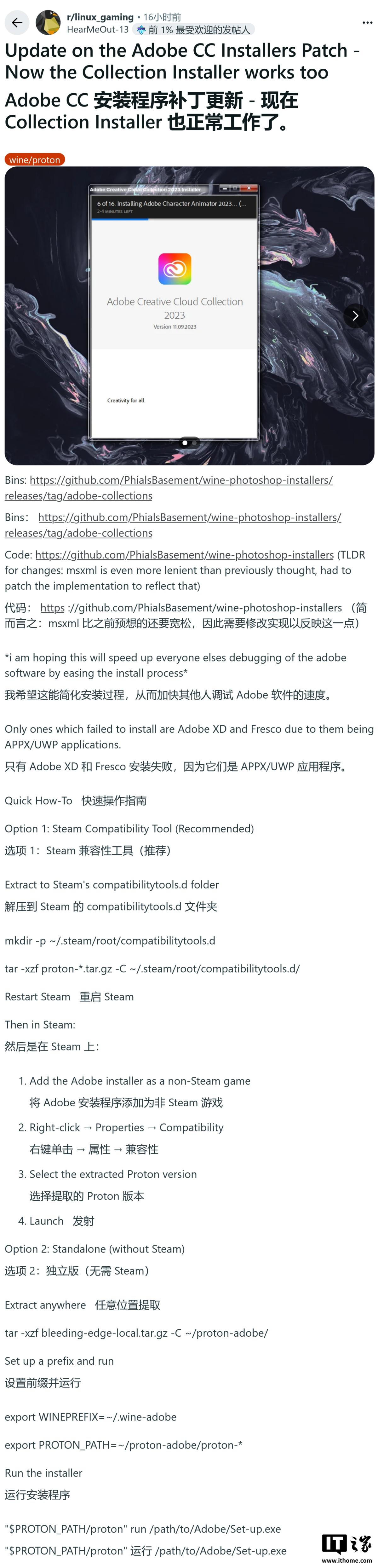 开发者此前曾尝试将补丁提交给 Valve 的 Proton 分支,但被建议直接合并入 Wine 项目主分支。一旦合并成功,全球 Linux 用户将无需任何额外操作,即可直接安装和运行 Adobe Creative Cloud。
