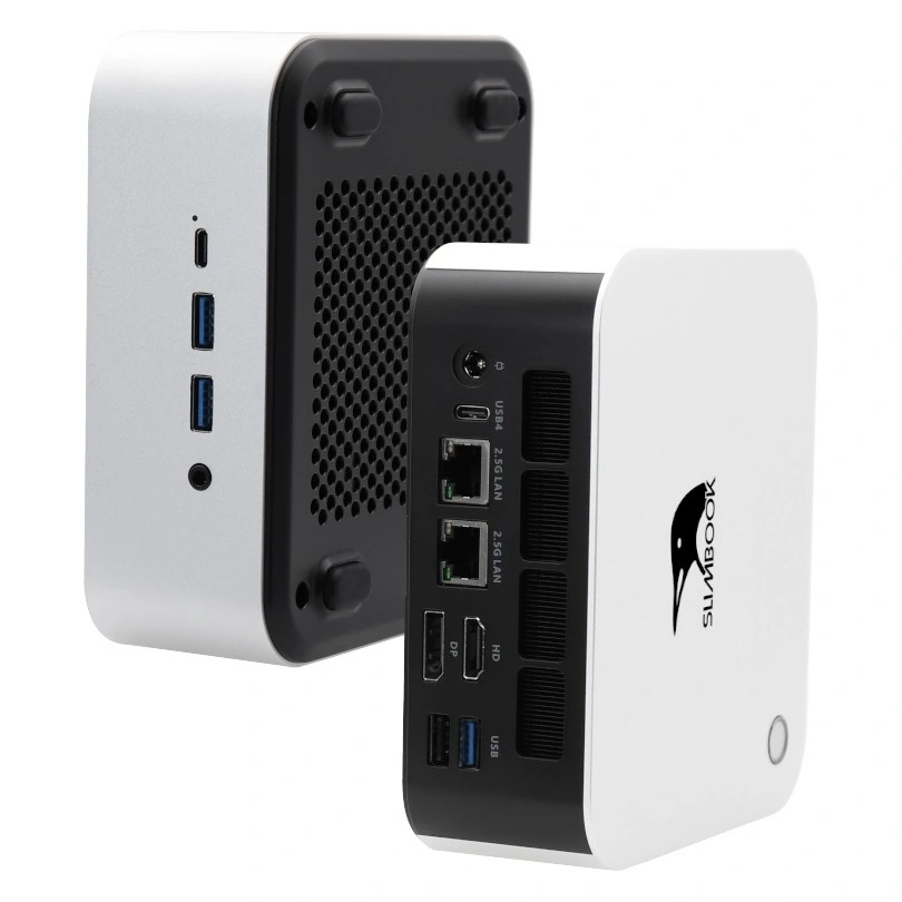 两个版本除处理器外大致相同,均采用 15×13×5.8 (cm) 的铝材 + 塑料机身,配备 2 个 DDR5 SO-DIMM 插槽、2 个 M.2 2280 PCIe 4.0×4 盘位,提供包括 2 个 USB4、2 个 2.5GbE RJ45、1 个 OCuLink 在内的接口。