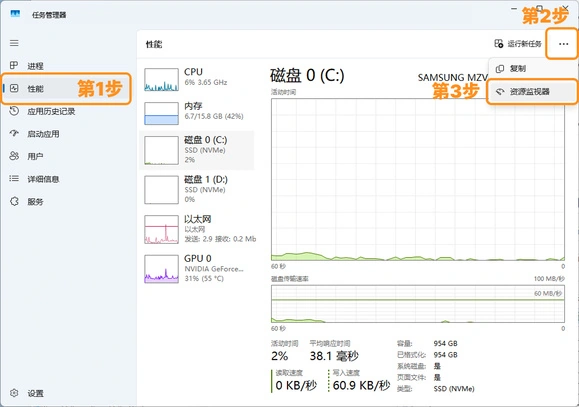 建议您使用 windows 自带的资源监控软件来进行检测,具体方法如下: