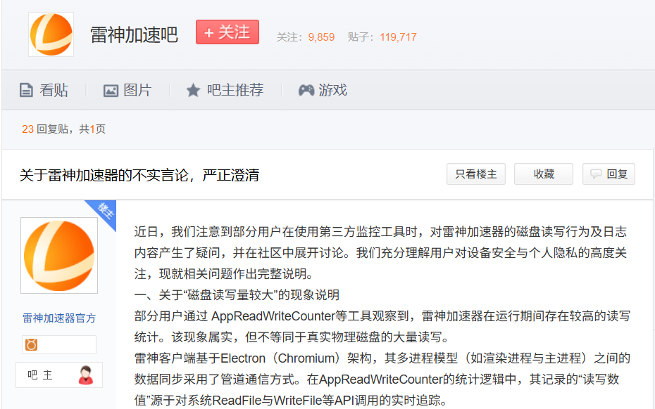 2 月 5 日消息,雷神加速器官方今日(2 月 5 日)在贴吧发布《关于雷神加速器的不实言论,严正澄清》,回应了“磁盘读写量较大”等现象。