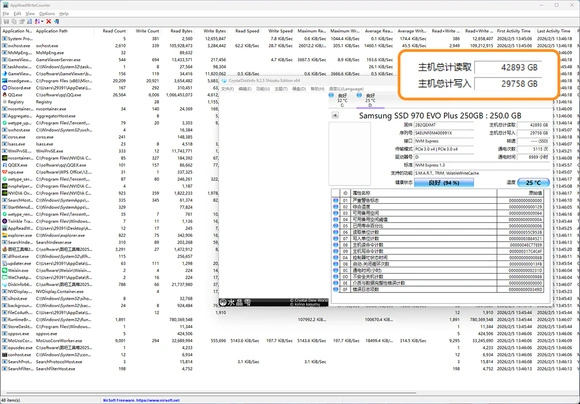 CrystalDiskInfo 是行业开源的专业硬盘监测工具,我们可以通过 CrystalDiskInfo 及 Windows 资源监视器等硬件级工具对比 Total Host Writes(主机写入总量)可以验证,从交叉结果来看雷神运行期间不会造成异常的物理写入增长。日志文件为小体量、顺序写入,不存在高频随机写盘行为。