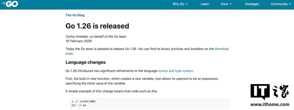 2 月 19 日消息,Go 语言团队现已正式发布 1.26 版本,本次更新主要改进泛型规则,同步提升运行性能,附项目地址(https://go.dev/blog/go1.26)。