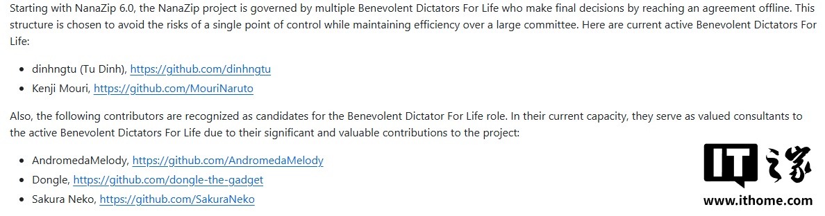 注意到,其项目治理结构也迎来了重大变化。自 6.0 版本开始,NanaZip 采用多位“终身仁慈独裁者”共同决策的模式,通过线下达成一致意见的方式做出最终决定。此举旨在避免单一决策点带来的风险,同时保持相对于大型委员会的高效运作。