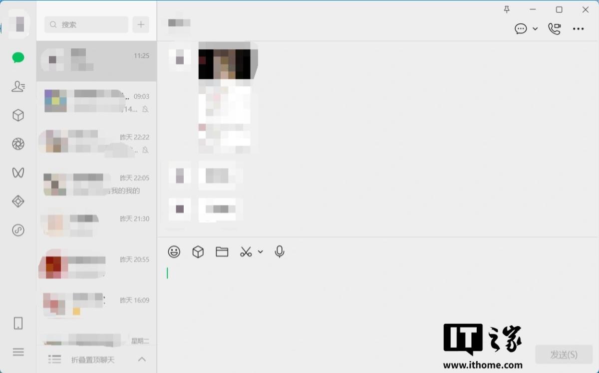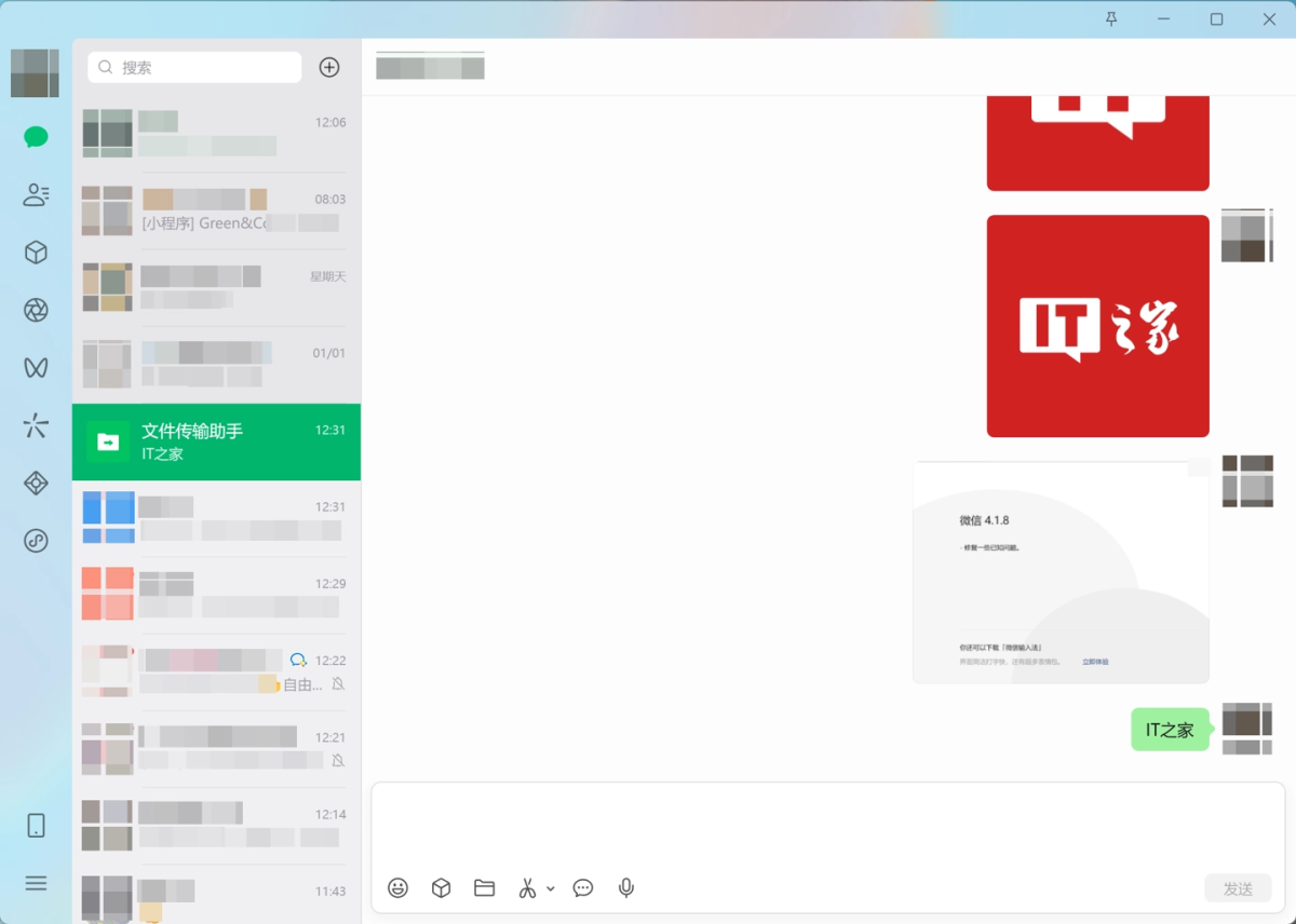 从图中可以看到,微信 4.1.8.21 版本的聊天窗口功能布局改变,功能按钮由输入框上方改变至最下方,选中聊天对象由原来的灰色变为深绿色。