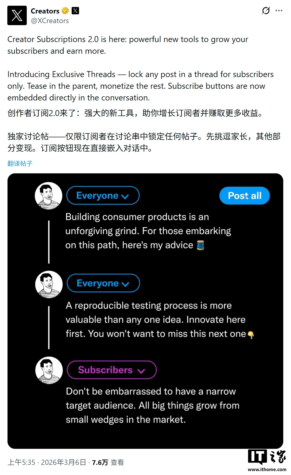 在本次服务升级中,最值得关注的是专属推文串(exclusive threads),创作者无需再将粉丝引流至外部网站或新闻简报,可以直接在 X 平台上实现内容变现。附上相关截图如下: