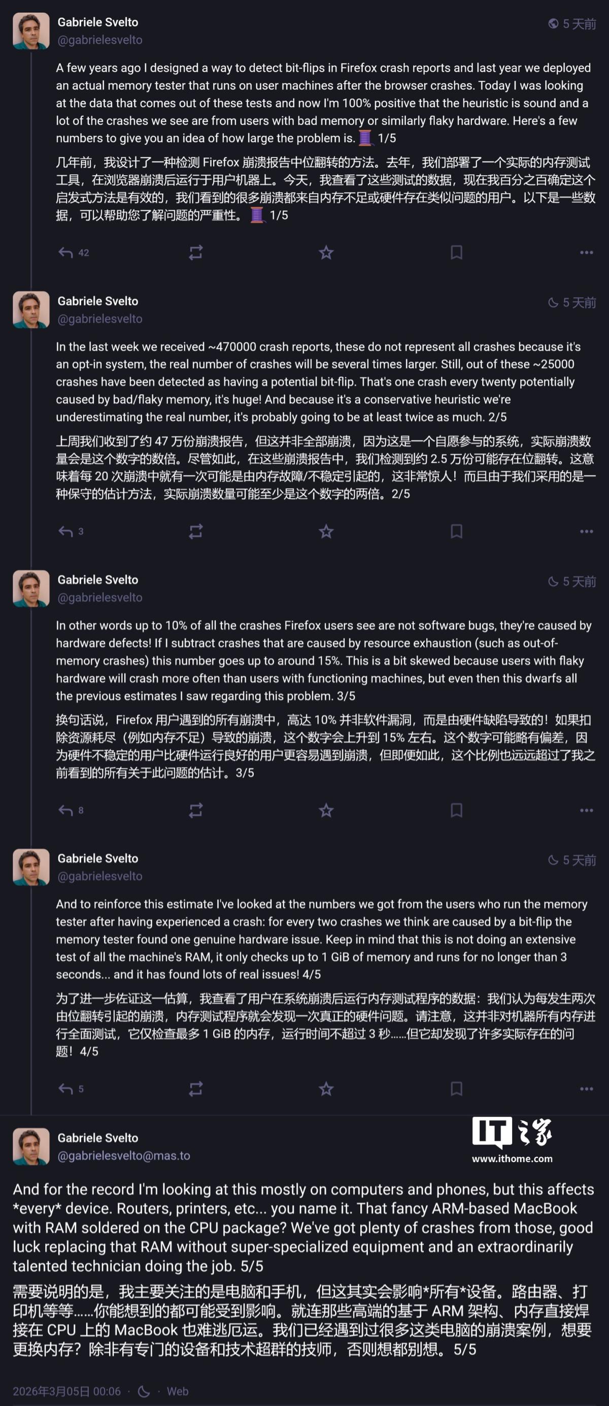 3 月 10 日消息,Mozilla 工程师 Gabriele Svelto 于 3 月 5 日在 Mastodon 平台发布动态,洞察分析导致火狐 Firefox 浏览器崩溃的原因,发现超过 10% 是由于内存芯片故障等物理硬件问题引发。