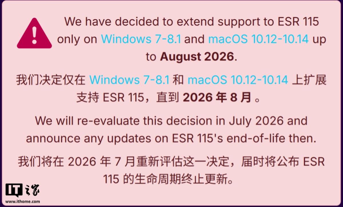 开发团队在官方页面的备注中明确强调:“我们决定将针对旧版 Windows 和 macOS 的 ESR 115 支持延长至 2026 年 8 月。同时,团队计划在 2026 年 7 月重新评估这一决定,随后再向公众宣布最终的停更细节。”这意味着 8 月可能并非绝对的终点,具体走向仍视用户数据而定。