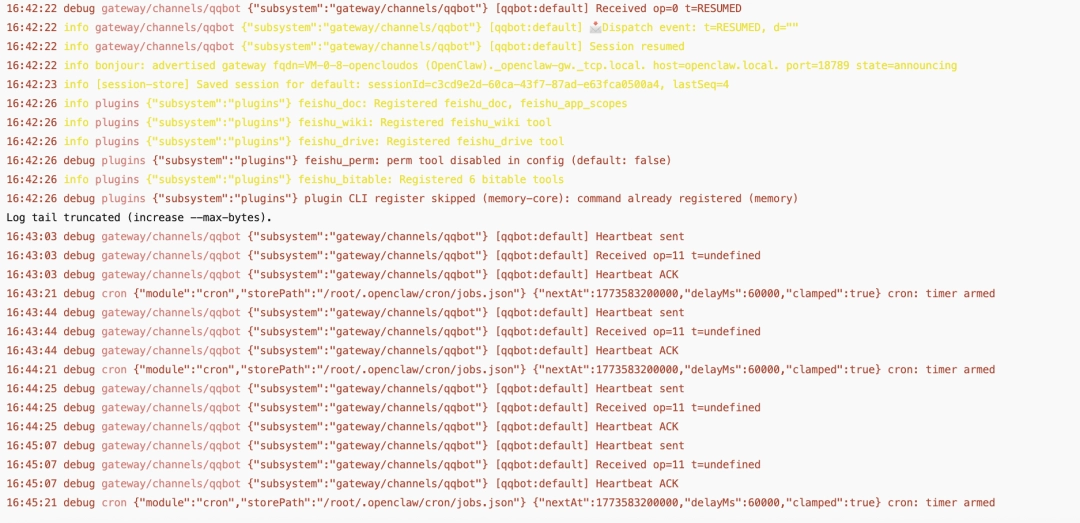 bash ./scripts/upgrade-via-source.sh --appid YOUR_APPID --secret YOUR_SECRET说明:脚本执行到后面会让选择是否后台重启 openclaw 网关服务?[Y/n],一般选择 Y。如果后台启动正常,会执行 openclaw logs --follow 持续输出 OpenClaw 运行日志。后面看到有日志持续输出代表已经正常启动了,不代表还没升级完,可以 Ctrl+C 关掉前台日志。