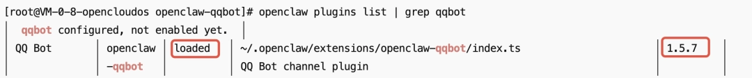 openclaw plugins list | grep openclaw-qqbot如果输出中存在对应插件条目,且状态为 loaded,说明QQBot 插件已经安装好了,而且已经被 OpenClaw 成功加载。但并不能说明通道一定连上了。