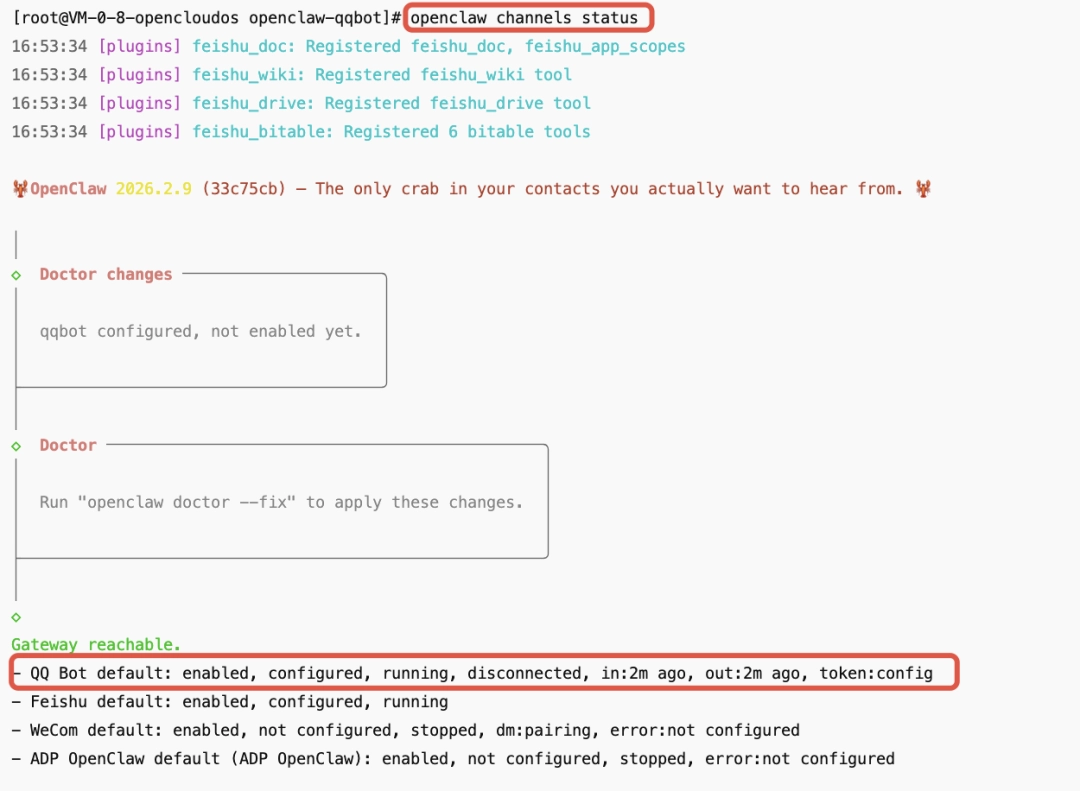openclaw channels statusopenclaw channels status 中 QQ Bot 通道显示为 enabled, configured, running,且机器人实际可以正常收发消息或 in / out 时间持续更新时,可认为 QQBot 通道已正常连通。