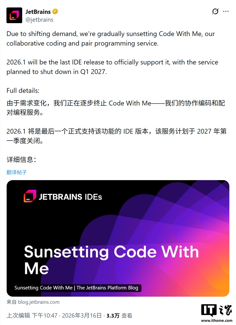 3 月 17 日消息,开发工具厂商 JetBrains 昨日(3 月 16 日)发布公告,宣布将逐步停用其集成开发环境(IDE)中的实时协作与结对编程功能“Code With Me”。