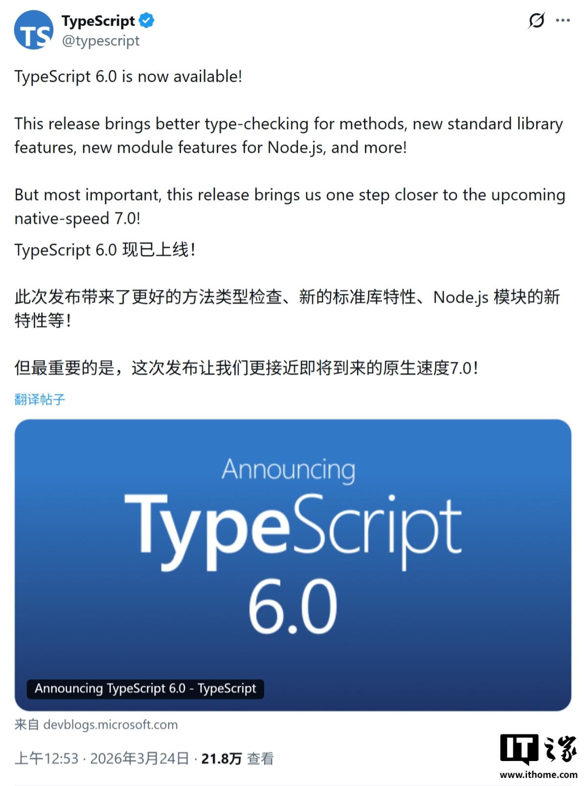 3 月 24 日消息,微软昨日(3 月 23 日)发布 TypeScript 6.0,这是基于 JavaScript 编译器代码库构建的最后一个版本,在未来 7.0 版本中,将迁移至 Go 语言。