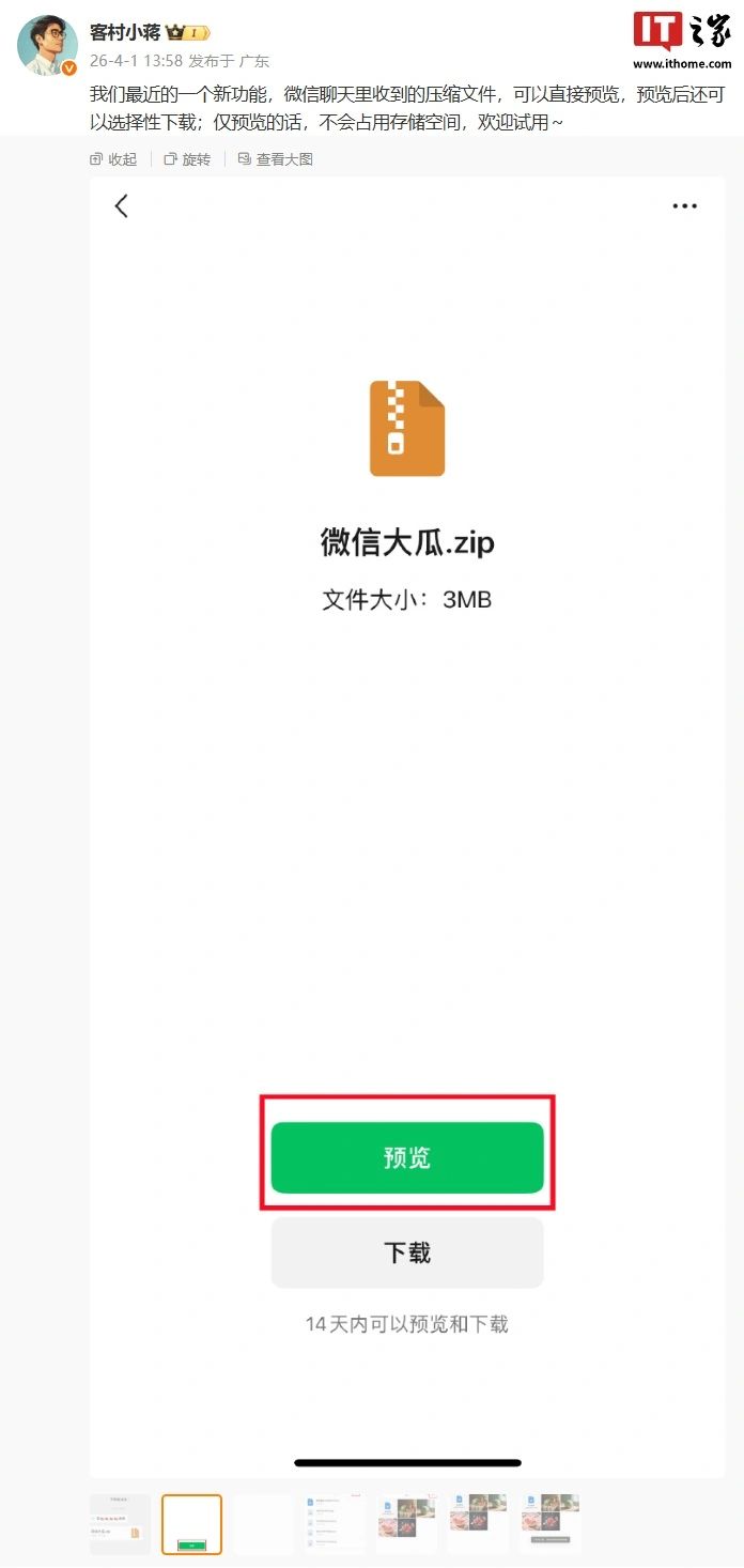 微信员工 @客村小蒋 今日发文谈及了这项新功能。他表示,微信聊天里收到的压缩文件,可以直接预览,预览后还可以选择性下载;仅预览的话,不会占用存储空间。