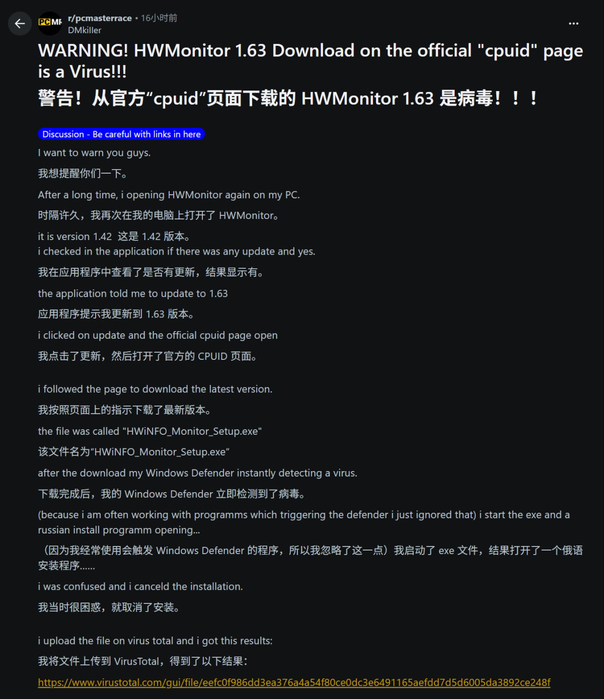 多名 Reddit 用户今天凌晨发现,从 CPUID 官网下载的 CPU-Z、HWMonitor 被 Windows Defender 报毒。他们进一步调查后发现,官网的下载链接一度被重定向至其他服务器,被替换的.exe 文件也被植入恶意代码。