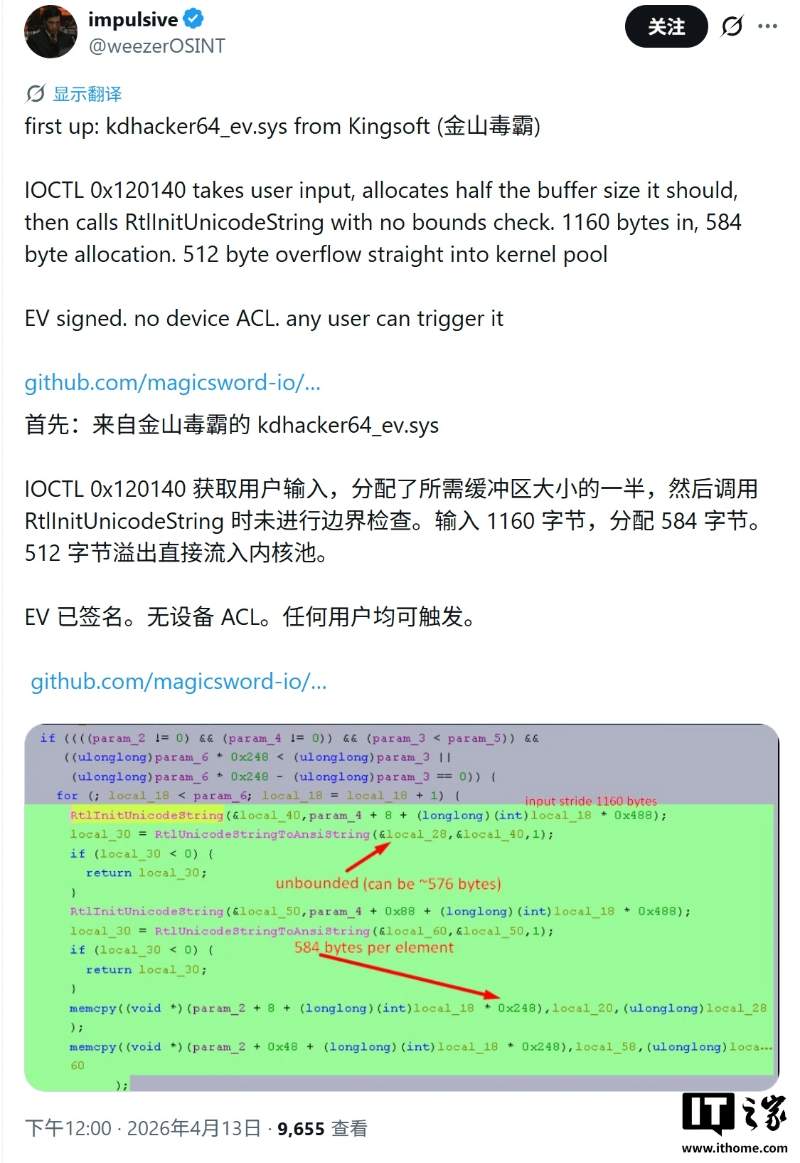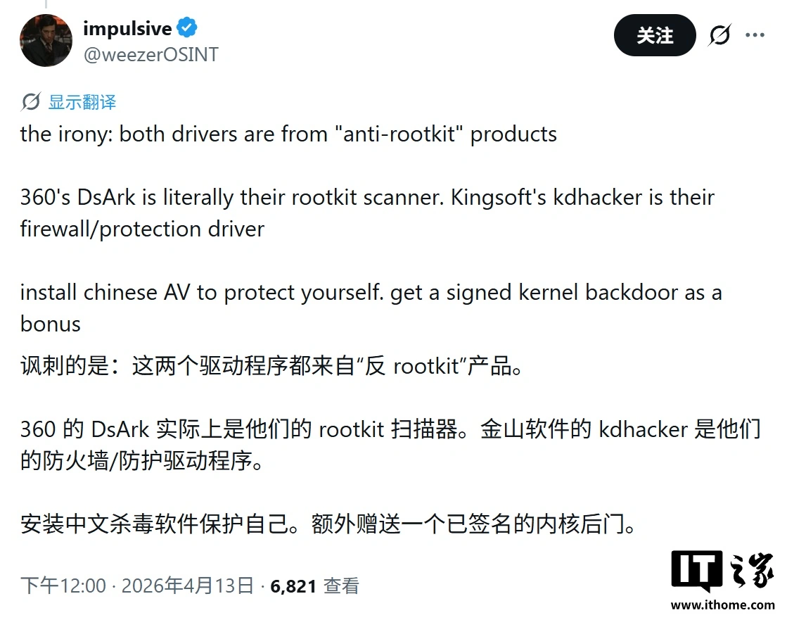 4 月 14 日消息,安全研究人员 Patrick Saif(@weezerOSINT)昨日(4 月 13 日)在 X 平台发布推文,披露金山毒霸与 360 安全卫士两款主流杀毒软件的内核驱动存在高危漏洞。