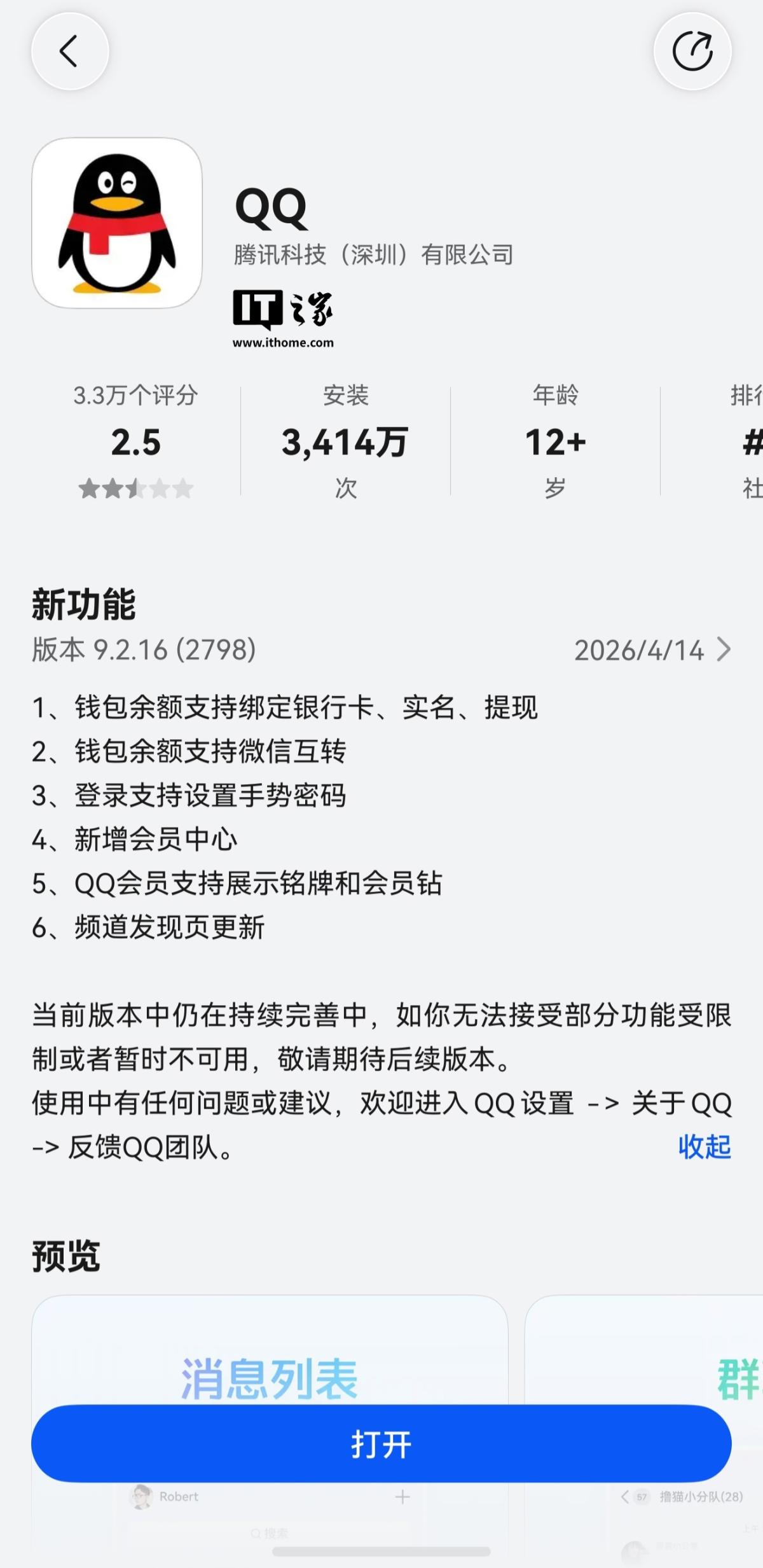 QQ 鸿蒙版 App 于 2024 年上架华为应用市场尝鲜专区,当前正式版本为 9.2.16 (2798),安装量突破 3414 万、获 3.3 万个评分(评分 2.5),已支持单聊、群聊、多人语音或视频通话、抢红包,刷空间好友动态、短视频、频道、扫一扫、手机 / 平板双端登录等功能。