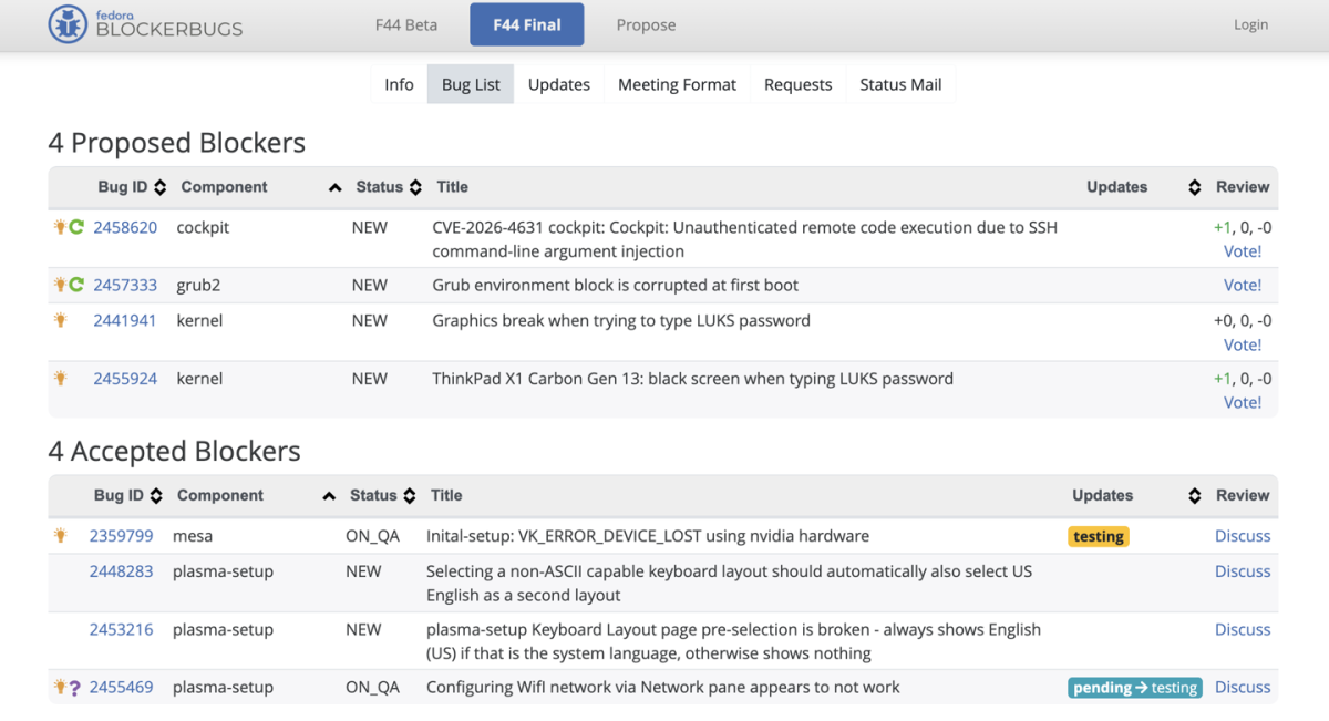 4 月 15 日消息,Fedora 质量保证(QA)开发者 Adam Williamson 发布邮件,宣布由于发行版存在一系列尚未解决的 Bug,且相应 Bug 中没有任何一个被同意“豁免”,因此 Fedora Linux 44 正式版将从 4 月 14 日推迟至 4 月 21 日后发布。