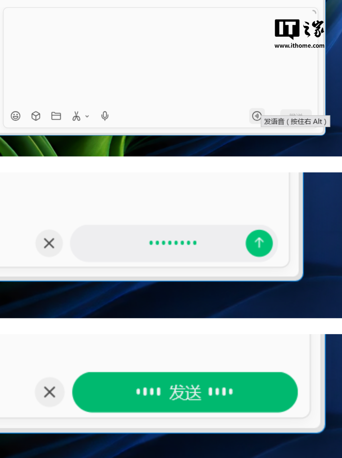 从截图可以看到,PC 版微信 4.1.9 内测版在聊天框的“发送”按钮旁边增加了一个语音按钮,用户也可以按住键盘的 Alt 键说话。