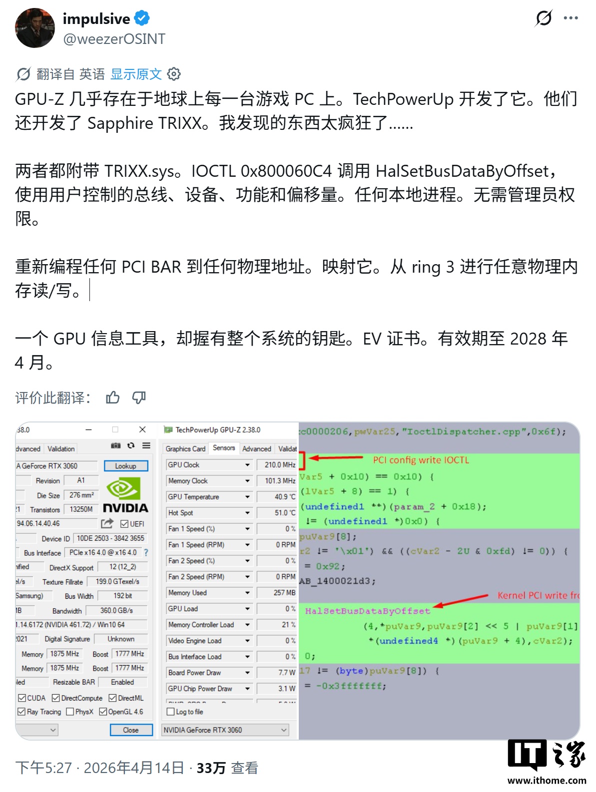 安全研究员 @weezerOSINT 在社交平台 X 发文,指控知名显卡检测工具 GPU-Z 存在严重安全漏洞。据其分析,攻击者可利用工具附带的驱动程序Trixx.sys中的漏洞,在无需管理员权限的情况下获取系统完整控制权。