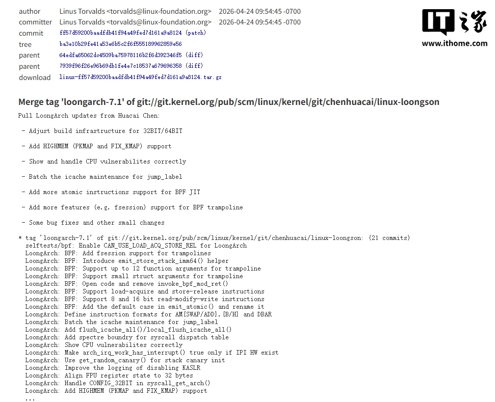 4 月 26 日消息,在即将结束的 Linux 7.1 内核合并窗口期中,LoongArch 架构支持迎来一系列更新,获得多项底层能力增强。