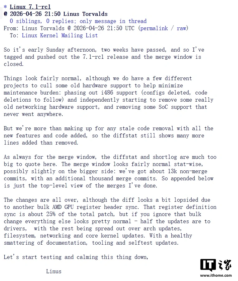 4 月 27 日消息,Linux 创始人 Linus Torvalds 今日发布了 Linux 7.1 内核的首个 RC 候选版本 Linux 7.1-rc1,标志着 7.1 版本合并窗口关闭。