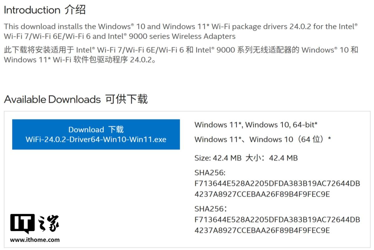 援引博文介绍,本次发布的 Wi-Fi 驱动版本号为 24.0.2,不仅兼容 BE200、BE201 和 BE202 等现有型号,更重要的是新增支持 BE211 和 BE213 等英特尔下一代 Wi-Fi 7 产品线。