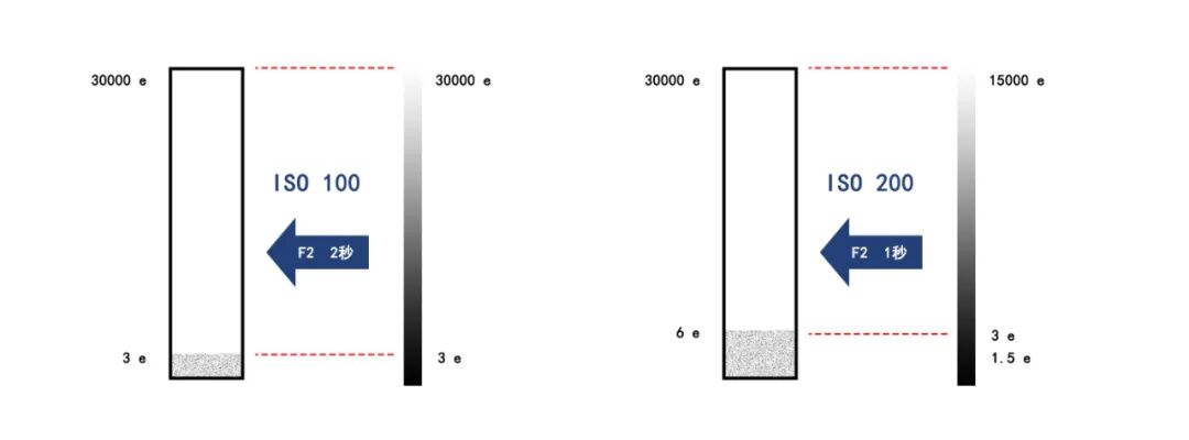 我们看右图,ISO 200 时,光圈 F2、快门为 1 秒。进光量减少了一半,所以最亮的地方只能产生 15000 个电子,产生的信号被 ISO 放大后,等效于 30000 个电子,刚好能被记录下来。