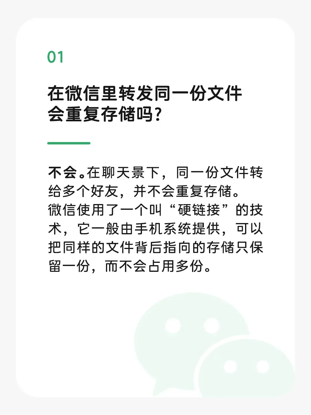 微信使用了一个叫“硬链接”的技术,它一般由手机系统提供,可以把同样的文件背后指向的存储只保留一份,而不会占用多份。