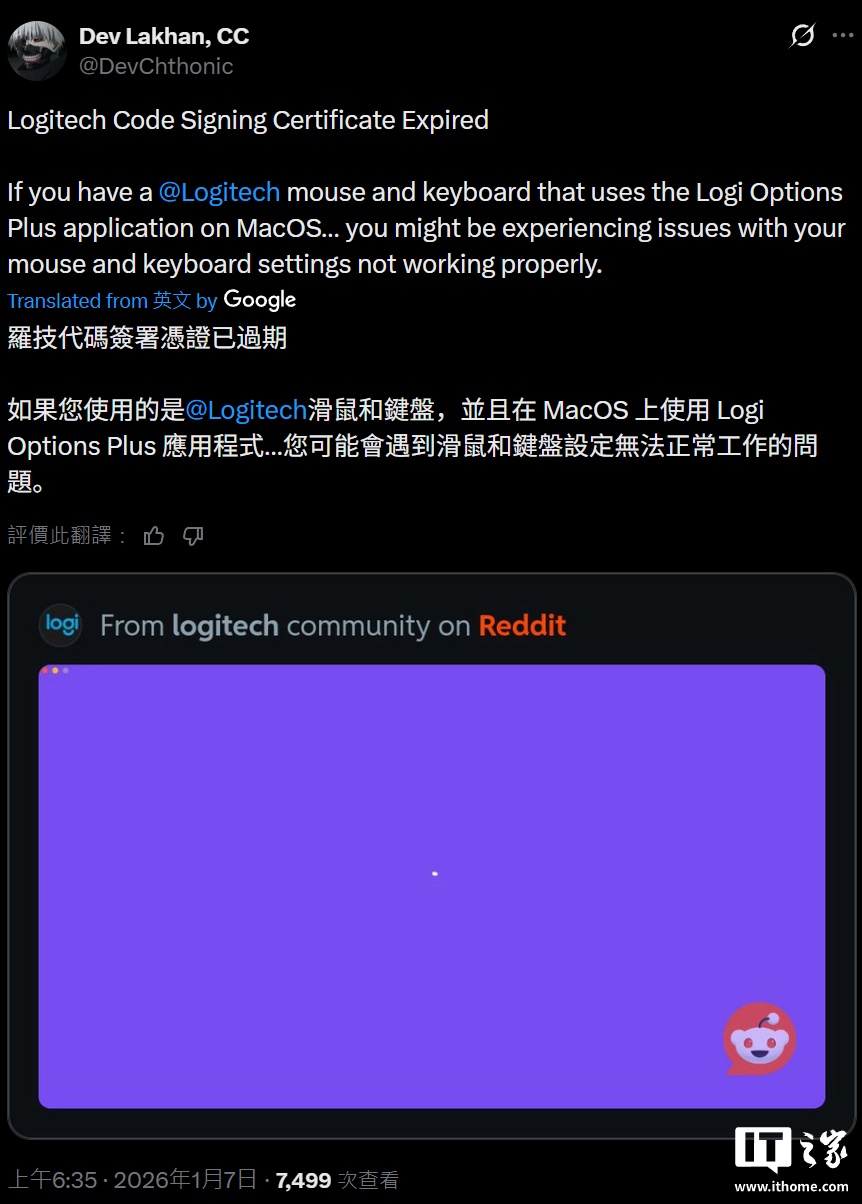 1 月 7 日消息,据多位小伙伴投稿,苹果 macOS 版罗技鼠标驱动软件 Options+ 和 G HUB 突然大规模故障,无法正常打开。