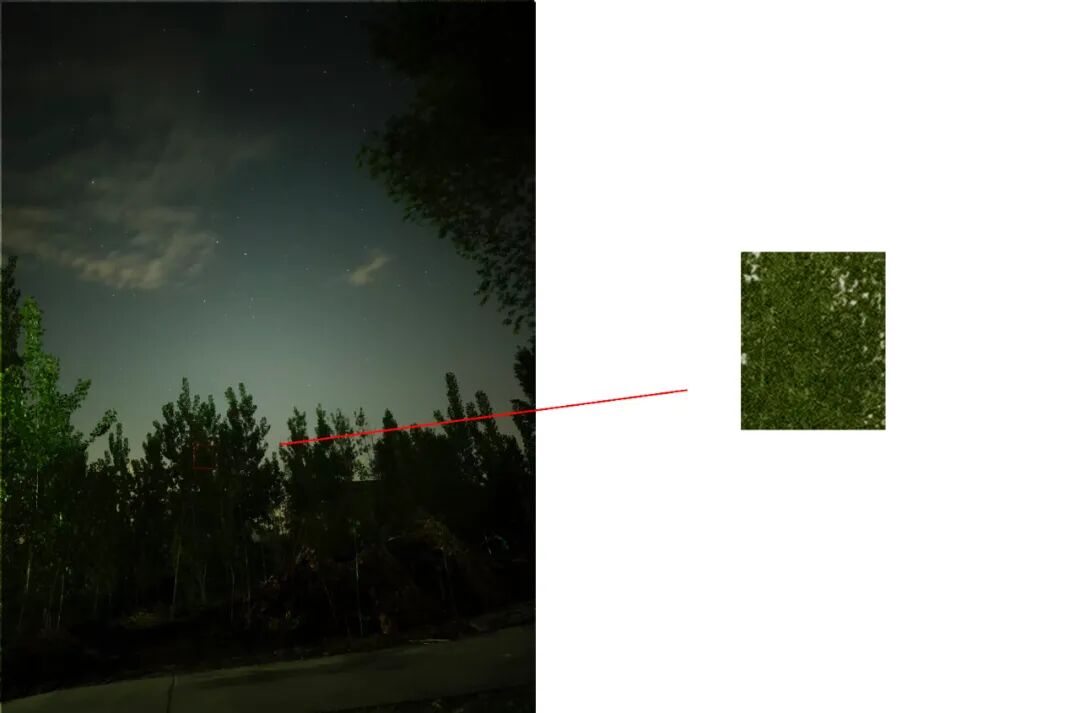 如图,进光量非常少的树叶部分,后期用 ps 提高亮度,可以看出细节几乎完全损失。我们期望的信号是均匀的,但实际拍摄时难免会产生波动,这就像一个班里每位同学的身高都不同,即使把所有人的身高都提高一倍,大家的身高依然有波动,所以提高亮度无法消除噪点。