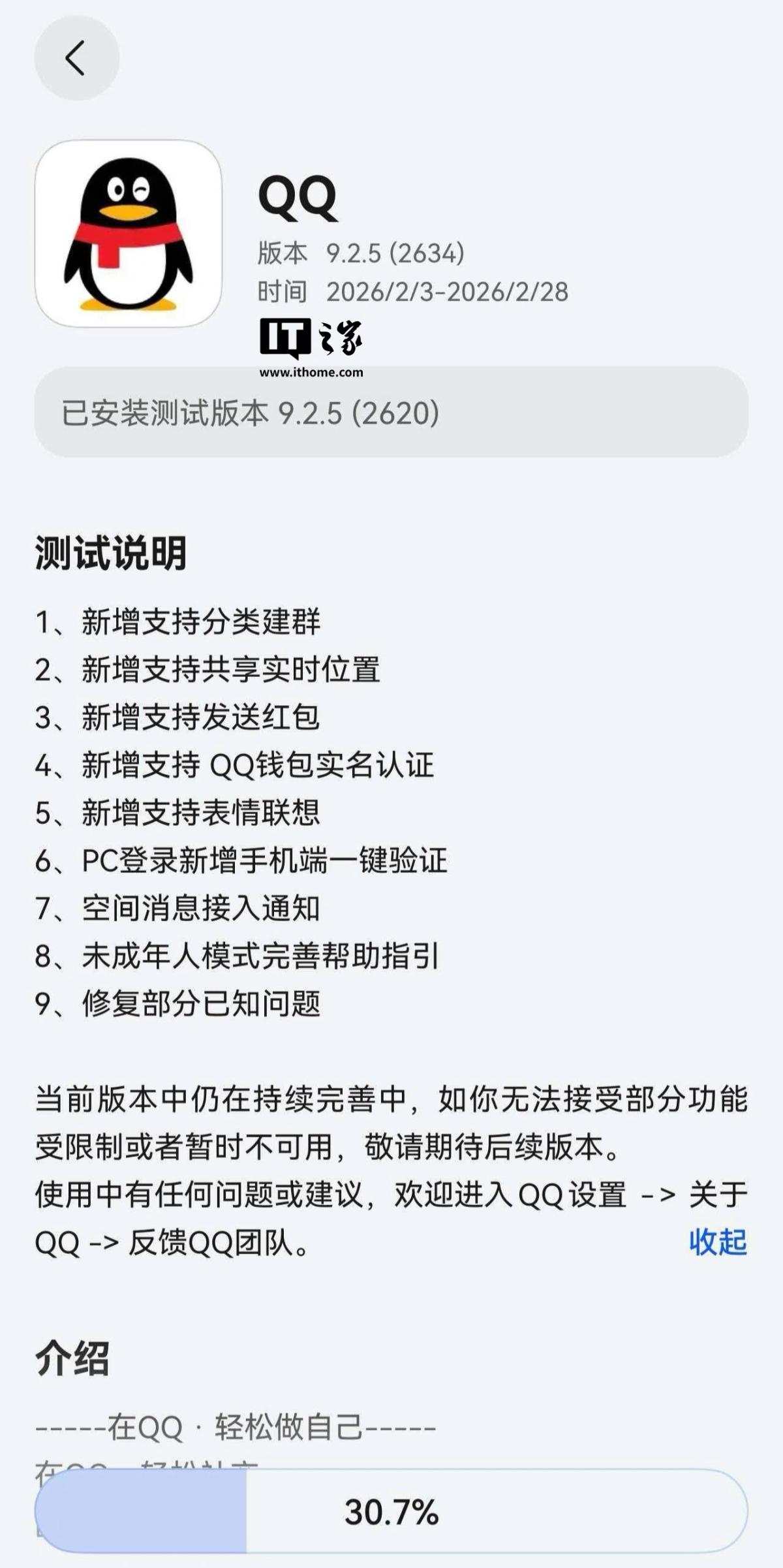 2 月 4 日消息,QQ 版 App 在华为应用市场(App Gallery)开启9.2.5 (2634)版本尝鲜升级(无需收到短信通知后点击链接跳转安装,可能量少,未来得及安装需等待官方“补货”),测试时间为 2026/2/3-2026/2/28。