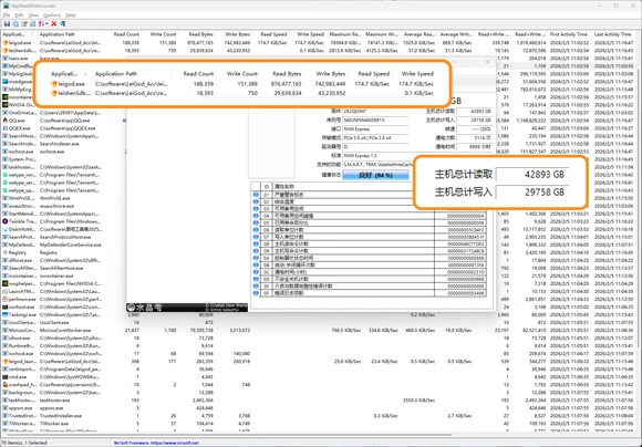 CrystalDiskInfo 是行业开源的专业硬盘监测工具,我们可以通过 CrystalDiskInfo 及 Windows 资源监视器等硬件级工具对比 Total Host Writes(主机写入总量)可以验证,从交叉结果来看雷神运行期间不会造成异常的物理写入增长。日志文件为小体量、顺序写入,不存在高频随机写盘行为。