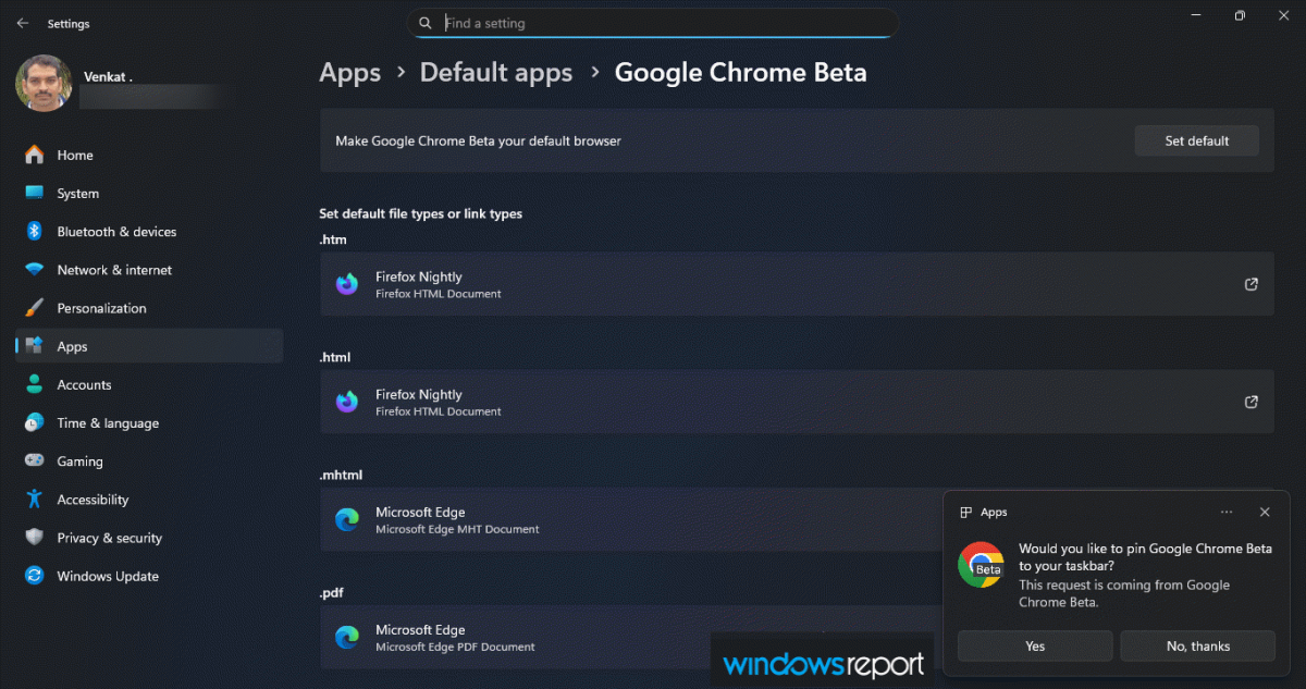 当用户点击“设为默认”后,Chrome 会打开 Windows 系统设置的默认应用界面,同时弹出通知,询问用户是否要将 Chrome 固定到任务栏上。