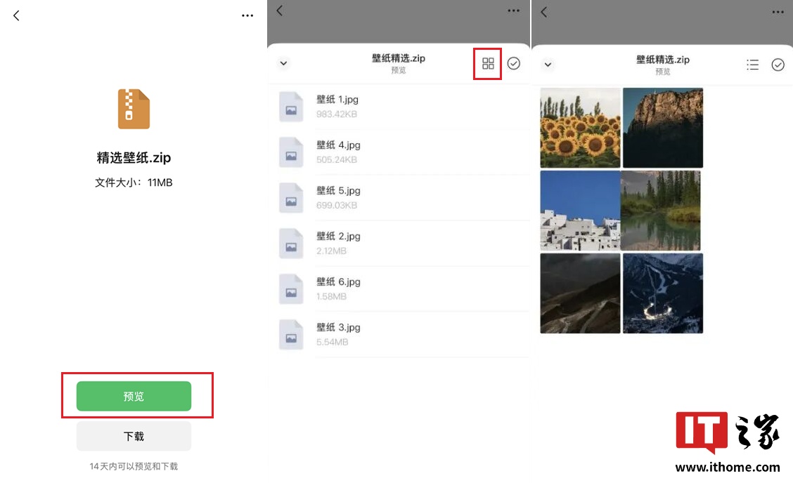 拥有测试资格的用户点击聊天界面的压缩文件后,会发现底部新增“预览”按钮,点击即可查看压缩包内文件列表,支持以列表或缩略图形式浏览,并可选择单个或多个文件进行转发、收藏或下载,无需下载整个压缩包。
