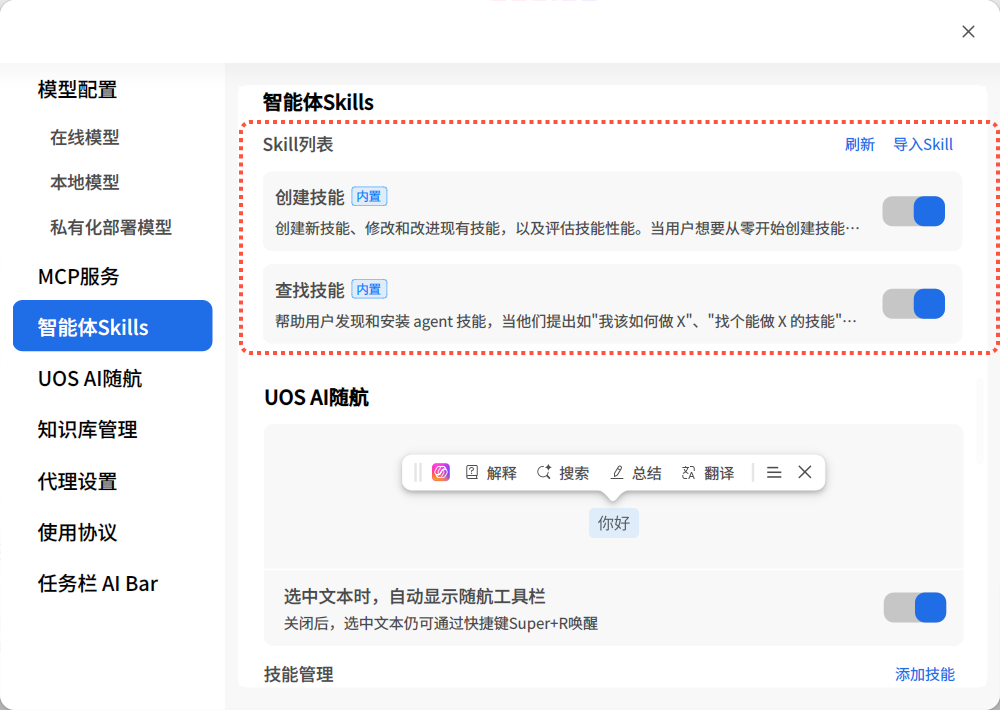 系统内置技能中心,支持导入或创建自定义技能,兼容 OpenClaw 体系。此外,AI 随航功能允许用户在任意软件、网页或 PDF 中划选文字后唤出 AI,实现翻译、总结、解释等操作。模型调度方面,默认集成 DeepSeek 3.2、GLM 4.7 等模型,系统根据任务难度动态匹配最优模型。
