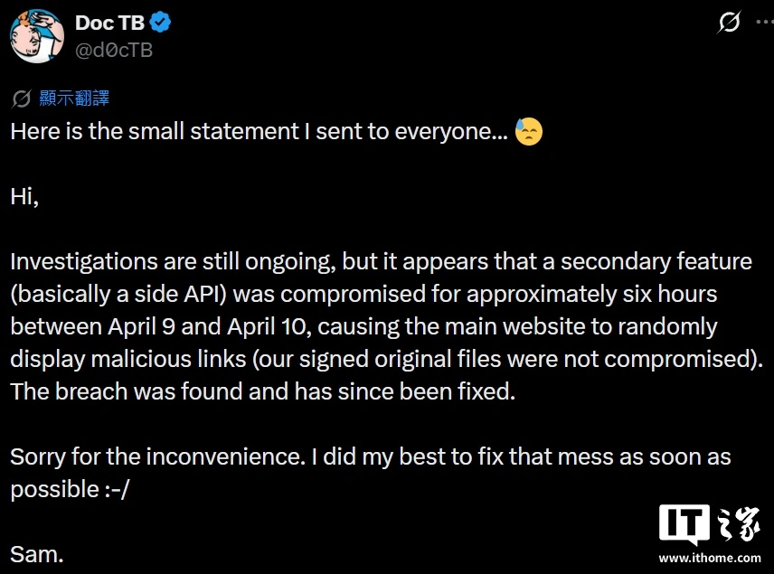 调查仍在进行中,但我们目前初步确认是一个次要功能(类似侧边 API)在 4 月 9 日-4 月 10 日之间被入侵 6 小时,导致主站随机显示恶意链接,原始签名文件本身并未被篡改。我们已经发现、修复问题。