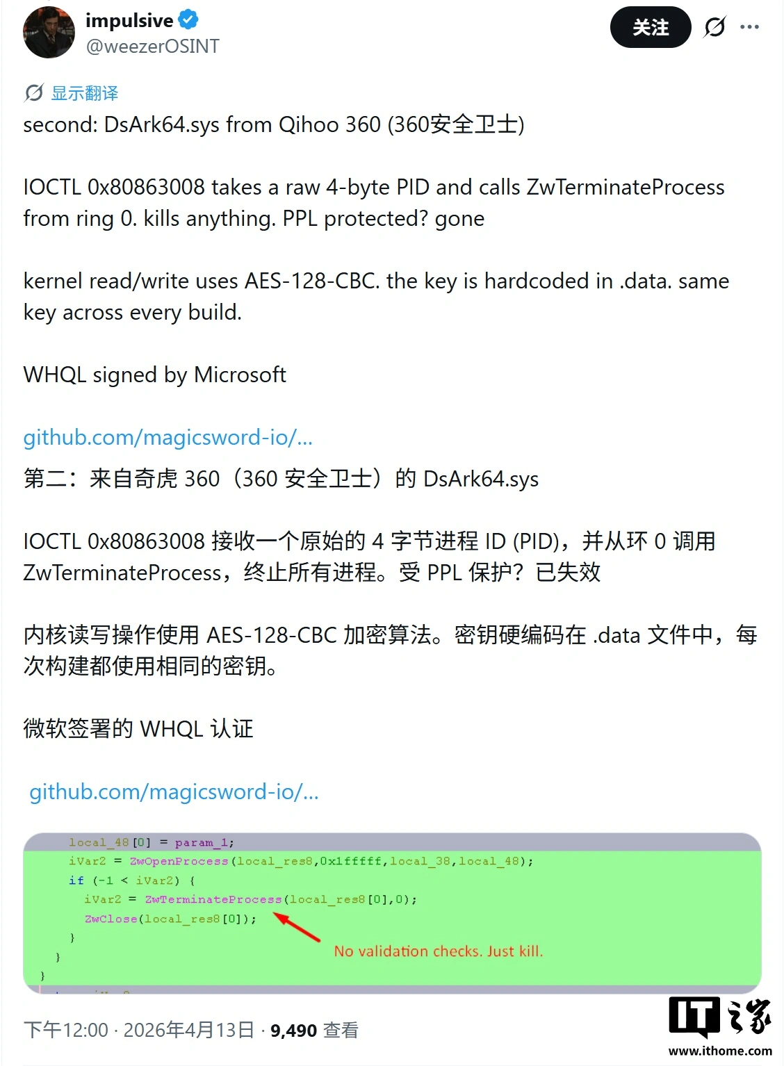 4 月 14 日消息,安全研究人员 Patrick Saif(@weezerOSINT)昨日(4 月 13 日)在 X 平台发布推文,披露金山毒霸与 360 安全卫士两款主流杀毒软件的内核驱动存在高危漏洞。