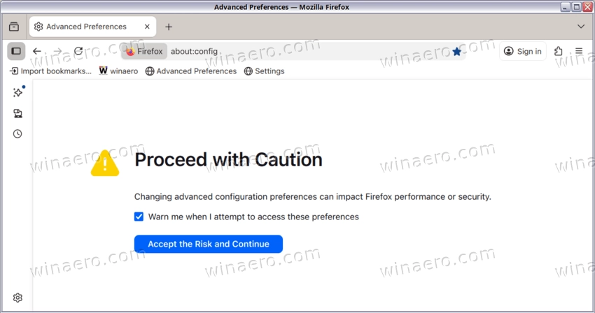 启动 Firefox 浏览器,在地址栏输入 about:config 并按回车键;