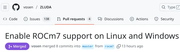 12 月 17 日消息,科技媒体 Wccftech 昨日(12 月 16 日)发布博文,报道称凭借着“打破英伟达 CUDA 的行业壁垒”光环,代码移植库 ZLUDA 在上线之初就备受关注,而在近期重大更新中,正式支持 AMD 最新的 ROCm 7 软件框架。